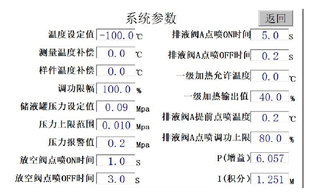 溫度設定值:設置低溫汽化器出口目標溫度值;測量溫度補償:設置低溫汽化器出口溫度傳感器校正值:樣件溫度補償:設置樣件溫度傳感器校正值;調功限幅:設置低溫汽化器二級加熱大輸出功率;儲液罐壓力設定值:設置儲液罐內目標壓力值;壓力上限范圍值:設置儲液罐內目標壓力范圍值:壓力報警值:設置儲液罐內目標壓力上限報警值;放空閥點噴