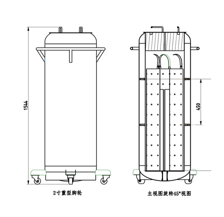 容器內(nèi)已經(jīng)添加了支撐結(jié)構(gòu),以增強(qiáng)運(yùn)輸耐性。容器采用高真空、多層絕熱結(jié)構(gòu)的形式,真空層中設(shè)有吸附劑,能夠長(zhǎng)期保持真空度。容器蓋由帽蓋和芯塞構(gòu)成,芯塞采用絕緣性能優(yōu)良的硬質(zhì)發(fā)泡塑料制成,不僅可降低液氮蒸發(fā)量,還能固定提筒。為了減少液氮在容器工作狀態(tài)中的蒸發(fā),提筒采用不銹鋼制造。提筒的提桿和桿筒組件之間采用玻璃纖維增強(qiáng)塑料細(xì)管連接,以提高絕緣性能。液氮罐上部安裝有定位環(huán),提筒可通過(guò)定位環(huán)上的槽和內(nèi)膽底部的凸起以及芯塞而固定,使得工作狀態(tài)更加穩(wěn)定,安全地進(jìn)行搬運(yùn)和長(zhǎng)途運(yùn)輸。